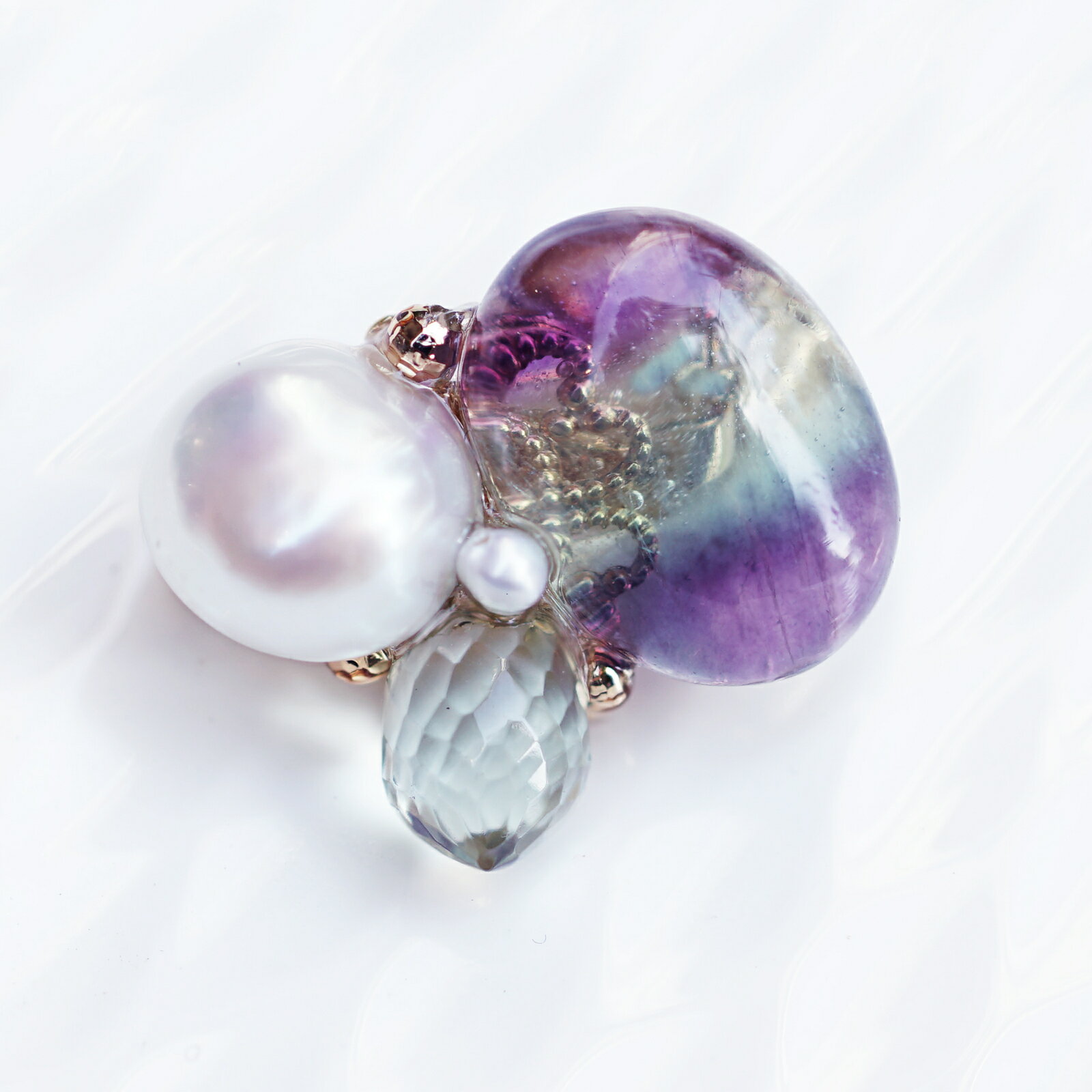 フローライトとグリーンアメジスト、真珠のブローチ ~Ophelia 天然石 ストーン シンプル ジュエリー 母の日 アクセサリー プレゼント ギフト お礼 おでかけ オフィス 学校 ブローチ お守り 入学式 天然石のブローチ 入園式 卒業式 縞模様が美しいフローライト、シャンデリアカットが細やかなグリーンアメジスト、ごろっとしたバロックシェイプがお洒落なバロック真珠。宝石のブーケのような幻想的なブローチです。 Ophelia/オフェーリア想像のなかでだけ花開く、幻想的な花のように天然石を組み合わせました。ストライプの縞模様が美しいフローライト、シャンデリアカットが細やかなグリーンアメジスト、ごろっとしたバロックシェイプがお洒落なバロック真珠を組み合わせています。シェイクスピアのオフェーリアの持つ花冠のように、夢幻を揺蕩うようなふわりとした柔らかさと清楚さを抱く宝石のブーケです。襟元はもちろん、ストールを留めたり、バックやペンケース、ワンピースのサイドウエスト付近に使ったり、ハットに着けるのもお勧めです。いつもと違うおしゃれが楽しめるブローチは近年のトレンドでもあります。エフォートレスな、シルエットに余裕のある装いにも映えて上質感を演出してくれます。意外にも、とても目を惹くジュエリーであるブローチには、ぜひ一番のお気に入りを探して。金具部合金ブローチ 約24×19mm※箱に入れてお送りします。※梱包資材は時期により予告なく変更する場合がございます。どのような梱包資材でも、工房スタッフが丁寧にお包みいたします。■淡水真珠についてパール 6月の誕生石石言葉:純潔 健康 長寿 富 品格 忍耐 安産 別名「月のしずく」「人魚の涙」とも呼ばれているほどの美しい光沢をもちます。今回は、イケチョウガイやカラス貝といった、淡水生の貝の中に出来る淡水パール(淡水真珠)を使用しています。■アメジスト/アメシストについて石言葉:誠実 心の平和 直感力 2月の誕生石 ■フローライトについて石言葉:知の石 美徳 平静 保護 治癒 不安を遠退ける 守られる 5