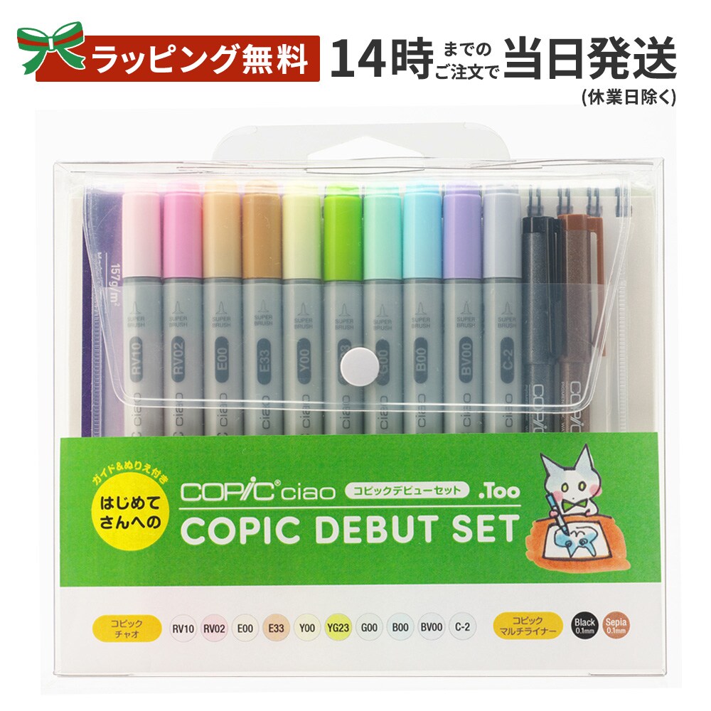 ■製品名:コピックチャオ コピックデビューセット■セット内容: ・コピックチャオ10色(BV00/RV02/RV10/Y00/YG23/G00/B00/E00/E33/C-2)・コピックマルチライナー ブラック 0.1mm・コピックマルチライナー セピア 0.1mm・コピックミニガイド・ぬりえ3種各1枚・コピックスケッチブック Sサイズ■発売日:2018年6月25日(月)チャオ10色、マルチライナー2本がセットになった、コピックを初めて使う方にオススメの商品です。<チャオシリーズの特徴>■コピックチャオ全180色。メーカー希望小売価格308円(税込)/本色のラインナップが全180色になっており、コピックスケッチよりもインク量を抑えているぶん手に取りやすい価格になっているエントリーモデルです。ニブの形状と品質はコピックスケッチと同等です。<メーカー商品HP>copic.jp/product/debut-set/<YouTube動画>www.youtube.com/watch?v=-wJeE-uWb80<商品の仕様変更について>2023/01/27(金)コピックチャオですが、以下URL先の通り、仕様変更が行われます。copic.jp/20230127※外部URL、コピック公式の案内ページです。(1)本体表示の変更(2)本体色の変更(2)構造改良詳しくは公式の案内ページをご確認ください。※商品画像は旧仕様のものです。※JAN コード、商品コード、製品ラインナップ(展開色/セット組)等の変更はございません。※切り替え期間中は仕様が混在しますが、インク・ペン先品質は変更ありません。在庫状況により新旧混在してのお届けとなります。新・旧どちらかを指定してご注文いただく事はできません。また、在庫の更新状況につきましても確認をしてお答えすることはできかねますので、あらかじめご了承ください。アルコールマーカー イラストマーカー マーカーペン セット 漫画 マンガ イラスト デザイン 誕生日 入学祝い プレゼント ギフト 定番JAN(EAN)コード:4511338055038沖縄県と一部離島へはお届けできません。
