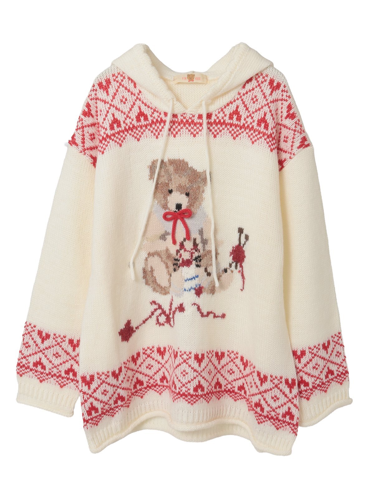 PINK HOUSE(ピンクハウス)三つ子のくまの冬支度柄編み込みフード付きニットしんしんと雪降る季節、そろそろ三つ子のくまの冬支度が始まります。赤いベレー帽をかぶった長男と、青いベレー帽をかぶった次男。そりすべりで前に座わってしまうやんちゃな次男、そんな次男を後ろで見守るように肩を支えて座る心優しい長男。編みものが大好きな少し年の離れた妹は、雪遊びでは思わずリンゴを投げてしまう・・・そんなおてんばな一面も。そんな三つ子のくまたちの冬支度を描いたハートフルなプリントです。こちらのプリントは、ピンクハウスとカールヘルムの共通プリントなので、カップルコーデも楽しめるそんな楽しさも盛り込んだテキスタイルに。編み物を楽しんでいる末っ子のくまをピックアップ。大きくフロントに編み込んだニット。床に赤い毛糸だまが転がっていて、何を編んでいるのかな??ピンクハウスのお洋服が好きな妹は、ピンクハウスのブラウスを着用。首もとには真っ赤なリボンを結んで。飾り紐を結んで立体的に見せているところがポイントです。くまの編み込みを挟むように、ノルディック調の飾りのラインを首まわりと裾まわり、そして袖ぐちにあしらって。カールヘルムが雪柄なのに対し、ピンクハウスはなんとハート柄でとても可愛らしい仕上がりに。フードの付いたニットパーカータイプは、とてもあたたかみのある仕上がりに。*お取り扱い注意事項*この製品は、素材や編み方の性質上、引っ掛け、引っ掛かりが起きやすい性質を持っています。お取り扱いには充分ご注意ください。・着脱時・着用時には、ベルト、バッグ、アクセサリー、周囲の壁などとの摩擦や引っ掛かりにご注意ください。・洗濯やクリーニングの際は、他のものとの引っ掛かりにご注意ください。・クリーニングの際は、取り扱い表示をご確認のうえ処理してください。この製品は、着用中、繊維の表面がこすられたり、もまれたりして、毛羽の小さなもつれが絡み合い次第に大きくなって毛玉になることがあります。これは素材の特性上避けられない現象で、その発生を防止する事はできません。毛玉が出来ましたら引っぱってとろうとせず軽くブラッシングするか、ハサミ等で取り除いて下さい。お洗濯につきましては、石油系溶剤による弱いドライクリーニングのみ可となっておりますので、クリーニング店にご相談ください。また、クリーニングにおきましても原寸仕上げ、またクリーニングネットを使用して下さい。洗濯後は形をととのえてすぐ干して下さい。素材の性質上、多少の縮みがあります。また、タンブラー乾燥の際、多少縮むことがあります。また、装飾部分にアイロンは控えるようお願いいたします。型番:A2153KPO471-02-9 QP0260【採寸】サイズ身幅ゆき着丈FREE507666商品のサイズについて【商品詳細】中国素材:アクリル53% 毛43% ナイロン2% ポリエステル2%サイズ:FREE※画面上と実物では多少色具合が異なって見える場合もございます。ご了承ください。商品のカラーについて 【予約商品について】 ※「先行予約販売中」「予約販売中」をご注文の際は予約商品についてをご確認ください。■重要なお知らせ※ 当店では、ギフト配送サービス及びラッピングサービスを行っておりません。ラッピング・ギフト配送について同時に複数の商品を注文された場合メーカー希望小売価格についてご利用ガイドPINK HOUSE(ピンクハウス)三つ子のくまの冬支度柄編み込みフード付きニットしんしんと雪降る季節、そろそろ三つ子のくまの冬支度が始まります。赤いベレー帽をかぶった長男と、青いベレー帽をかぶった次男。そりすべりで前に座わってしまうやんちゃな次男、そんな次男を後ろで見守るように肩を支えて座る心優しい長男。編みものが大好きな少し年の離れた妹は、雪遊びでは思わずリンゴを投げてしまう・・・そんなおてんばな一面も。そんな三つ子のくまたちの冬支度を描いたハートフルなプリントです。こちらのプリントは、ピンクハウスとカールヘルムの共通プリントなので、カップルコーデも楽しめるそんな楽しさも盛り込んだテキスタイルに。編み物を楽しんでいる末っ子のくまをピックアップ。大きくフロントに編み込んだニット。床に赤い毛糸だまが転がっていて、何を編んでいるのかな??ピンクハウスのお洋服が好きな妹は、ピンクハウスのブラウスを着用。首もとには真っ赤なリボンを結んで。飾り紐を結んで立体的に見せているところがポイントです。くまの編み込みを挟むように、ノルディック調の飾りのラインを首まわりと裾まわり、そして袖ぐちにあしらって。カールヘルムが雪柄なのに対し、ピンクハウスはなんとハート柄でとても可愛らしい仕上がりに。フードの付いたニットパーカータイプは、とてもあたたかみのある仕上がりに。*お取り扱い注意事項*この製品は、素材や編み方の性質上、引っ掛け、引っ掛かりが起きやすい性質を持っています。お取り扱いには充