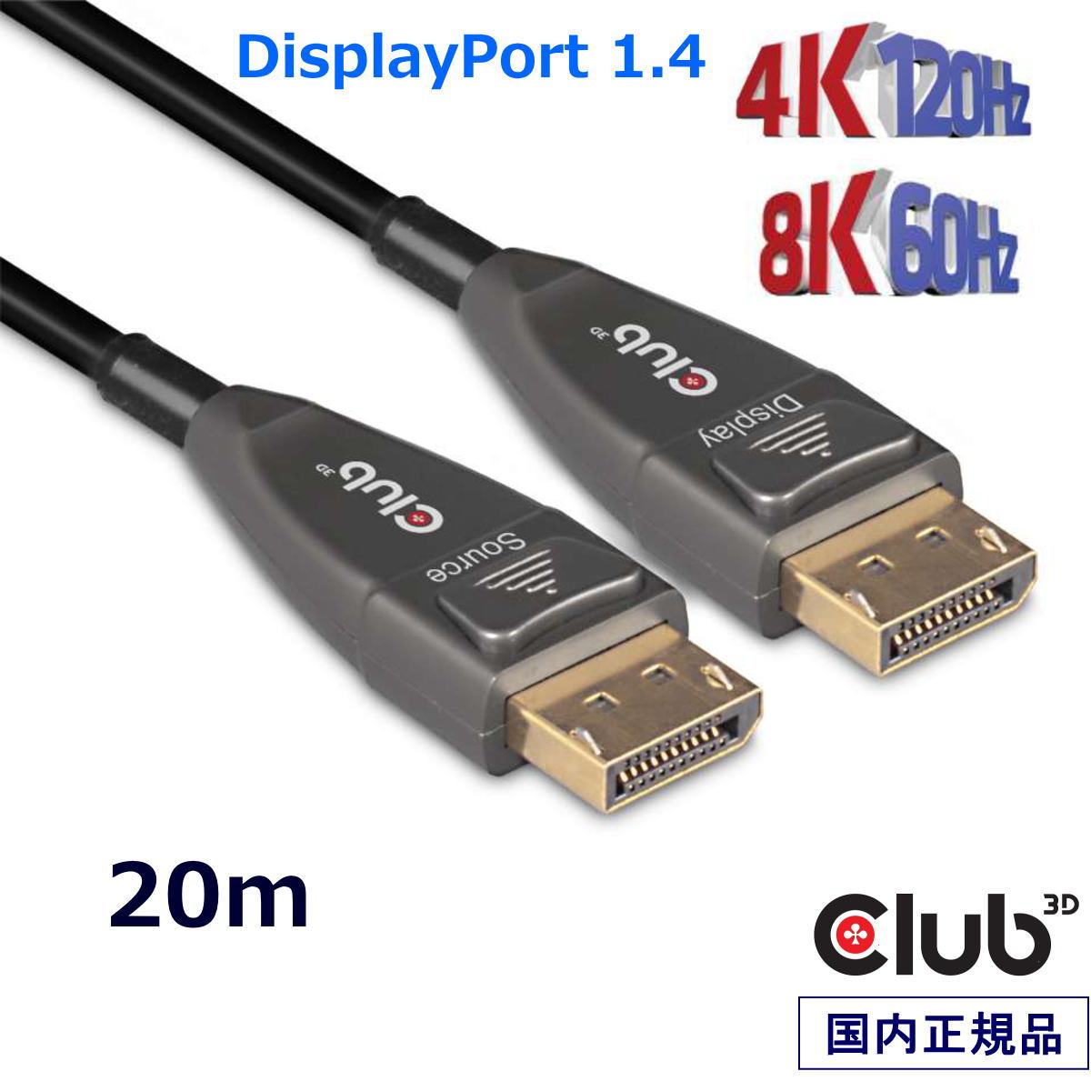 国内正規品 Club 3D DisplayPort 1.4 アクティブ 光ケーブル Active Optical Cable 単方向 4K120Hz 8K60Hz オス/オス 20m (CAC-1079)