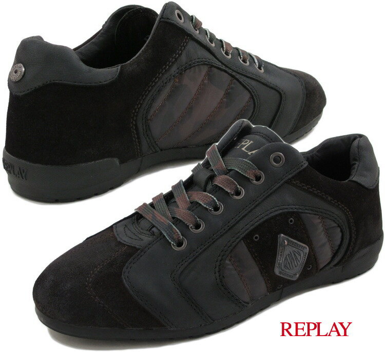 REPLAY/リプレイ Leather Sneakers “PRESS” CAMO柄使い、レザースニーカー 090-DK BROWN/BLACK(ダークブラウン×ブラック)/GMS22