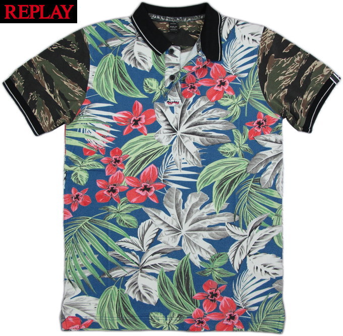 REPLAY/リプレイ M3194B ALL-OVER PRINTED COTTON POLO SHIRTSボタニカル&カモフラージュ総柄プリント、半袖ポロシャツHAWAI/CAMO(ハワイアン&カモ)
