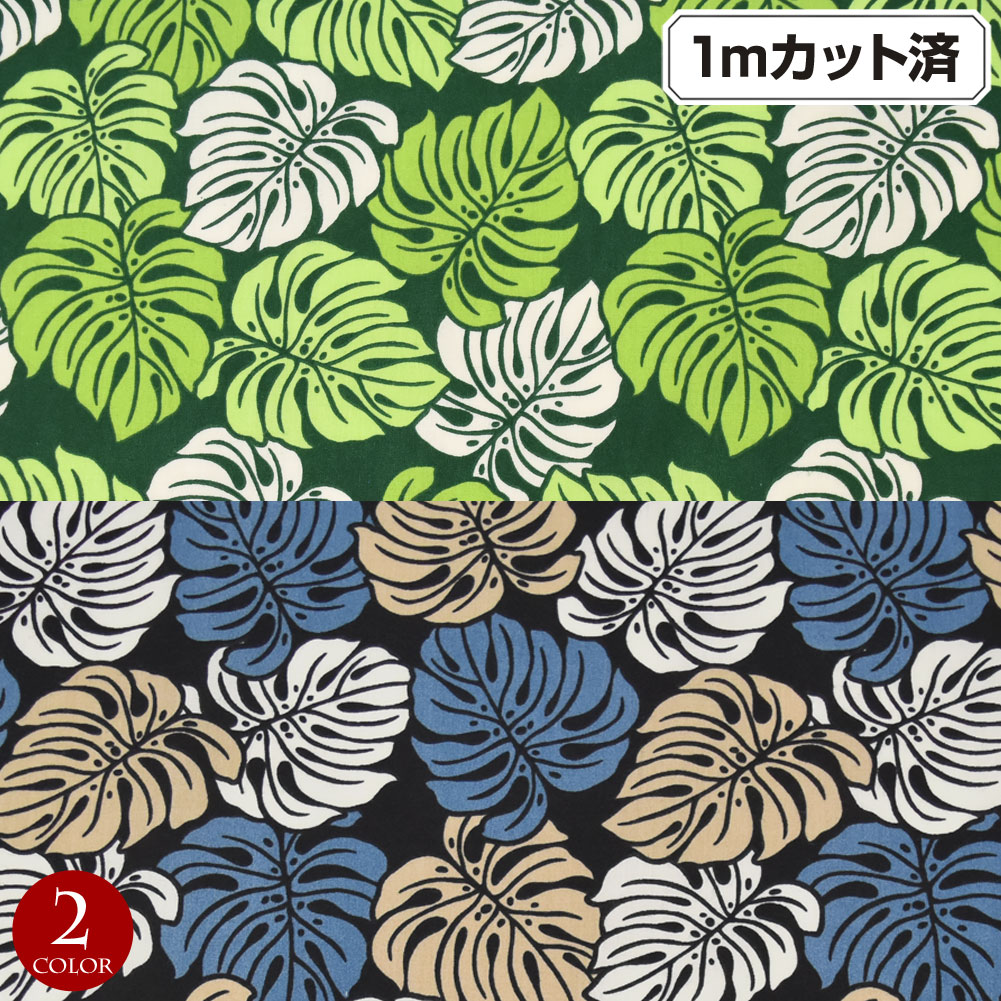【即納】生地 ハワイ柄 ハワイアン柄生地(約113cm巾x1mカット済) モンステラ リーフ 葉 シーチング生地 布 ハワイ柄生地 柄生地 ハワイアンプリント生地 インテリア生地 パウスカート クッションカバー バッグ 綿混 薄地 ブラック グリーン L47Y35 [M便 1/3] PNF