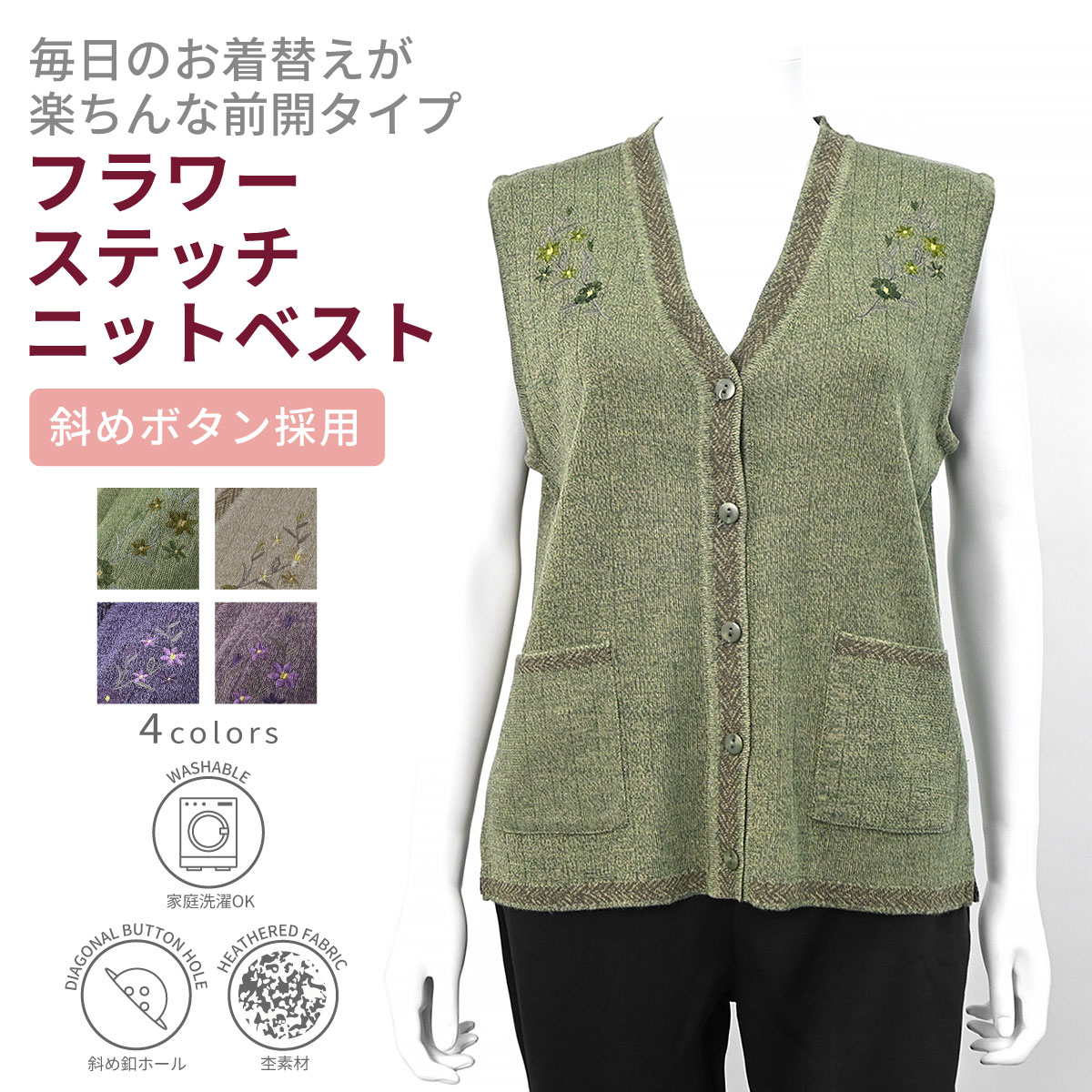 商品管理番号208611商品名婦人 斜め釦 ホール Vネック ジャガード ゴム地刺繍 ベスト Pono Marie ポノマーリエサイズフリーサイズ(M~L相当) 身丈:63cm 肩幅:41cm 身幅:50cm素材アクリル95%、毛5%特徴Pono Marie ポノマーリエ ニット商材を中心とした機能性に特化したブランドです。 【斜めボタンホール】ボタンを迎えるように斜めにボタンホール、大きめボタンを使っているので、掴みやすく、留めやすい製品です。 【ジャガード】織りはその複雑な模様と高級感から、高級ファッションやインテリアに多く採用されています。 【アクリル】石油から取れるアクリロニトリルを原料とする合成繊維です。アクリルは同じ合成繊維であるポリエステル・ナイロンと並んで3大合成繊維の一つとされており、現在流通している合成繊維の大部分はこの3つが占めています。柔らかくてボリュームがあり、保温性に優れているアクリルは、ウールの代用品として使われる事が多い素材です。また、ウールを含めた他の素材と混紡して使われる事も多く、ニットの素材として人気のある素材です。ウール特有のチクチクした肌触りが無いので、敏感肌の方も安心して着用する事が出来ます。繊維に弾力性があるのでシワになりにくい素材、回復力にも優れているので、多少のシワであれば水分を含ませる事で元に戻す事が出来ます。 【ウール】ウールは羊から取れる天然繊維で防寒性に優れ、弾力がありシワになりにくい素材です。モコモコで弾力のある肉厚な素材が魅力です。柔らかく体を包み込んでくれる安心感があります。 【ユニバーサルデザイン】加齢に伴う体型変化や身体能力の低下。それらのちょっとした困りごとを機能でサポートしながら、お洒落やお出掛けを楽しんで頂きたい。服を着る楽しみがなくなると、家を出るのが嫌になるもの。元気の出る明るい色を着れば、デイサービスや、老人ホームに行くのも楽しくなります。寝たきりの防止にも最適です。名札付きの衣料品は施設や入院、デイケアで活躍します。介護が必要なご年配のお客様の為に、介護者にとっても着せやすい工夫が凝らされており、麻痺が残る方でも着やすく、病院でのリハビリや通院が必要なお客様に便利です。 【ウォッシャブル素材】繊維の切れにくい丈夫な素材を使用しており、しわになりにくく、すぐ乾き、イージーケア。アイロン掛けも簡単です。安定性の高い素材ですので、デリケートな天然繊維100%の素材と違い、ご家庭の洗濯機で洗えるのが嬉しいポイント。一方で繊維が切れにくい素材は絡まった繊維が抜け落ちず、毛玉が目立ちやすくなる為、お洗濯の際には裏返してネットを使用するなどの注意が必要です。カラーネイビー、ベージュ、グリーン、パープル注意事項■素材の特性上、お洗濯やクリーニングにより多少の縮みやねじれが生じる場合もございます。 ■商品の撮影には最大限注意を払っておりますが、閲覧時のモニター環境によりましては実際の商品と若干違うお色味に映ることもございます。検索ワード40代 50代 60代 70代 お誕生日 母の日 ギフト ホワイトデー クリスマス お祝い 贈り物 お得 安い シニアファッション ミドルファッション レディース 春 秋 冬 シニア ミセス ハイミセス マダム お母さん おばあちゃん 高齢者 祖母 洋服 衣類 婦人服 女性 ゆったり 洗える 旅行 お出掛け あったか ユニバーサルデザイン オシャレ ブランド プレゼント ネイビー ベージュ グリーン パープル M~L相当 フリーサイズCOLOR:グリーンCOLOR:ベージュCOLOR:ネイビーCOLOR:パープル ◆このブランドの他アイテムはコチラ◆