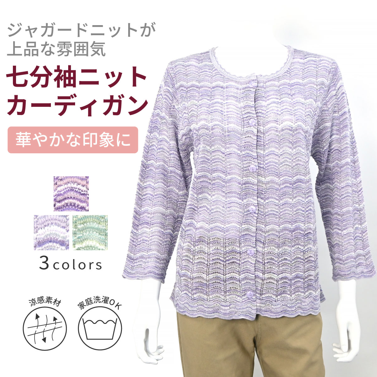 商品管理番号261575A商品名婦人 七分袖 丸首 かすり ジャガード ニット カーディガン Pono Marie ポノマーリエサイズフリーサイズ(M~L相当) 身丈:62cm 肩幅:40cm 身幅:51cm 袖丈:50cm素材アクリル90%、ナイロン5%、ポリエステル5%特徴Pono malie ポノ・マリーエ ニット商材を中心とした機能性に特化したブランドです。 【ジャガード】織りで複雑な柄を作り上げていく生地のことをいいます。 無地の生地に印刷するプリント生地とは対照的に、ジャガード織は生地そのものに柄を織り込み、糸の凹凸や陰影、手触りで柄を感じられる特徴があります。 【アクリル】石油から取れるアクリロニトリルを原料とする合成繊維です。アクリルは同じ合成繊維であるポリエステル・ナイロンと並んで3大合成繊維の一つとされており、現在流通している合成繊維の大部分はこの3つが占めています。柔らかくてボリュームがあり、保温性に優れているアクリルは、ウールの代用品として使われる事が多い素材です。また、ウールを含めた他の素材と混紡して使われる事も多く、ニットの素材として人気のある素材です。ウール特有のチクチクした肌触りが無いので、敏感肌の方も安心して着用する事が出来ます。繊維に弾力性があるのでシワになりにくい素材、回復力にも優れているので、多少のシワであれば水分を含ませる事で元に戻す事が出来ます。 【ナイロン】その強度、軽量性、速乾性、弾力性、耐薬品性、耐紫外線性などの多くの優れた特性から、衣類やアクセサリー、工業用途まで幅広い分野で使用される非常に汎用性の高い素材です。 【ポリエステル】軽量で着心地が良く運動時にも自由に動きやすく強い素材であり、摩耗や引っ張りに対して耐性があります。そのため、衣料品やバッグなどの製品に広く使用されており速乾性が高く、湿気を吸収せずに素早く乾燥するため、スポーツウェアや水着などに好まれます。シワになりにくい素材であり、洗濯後も形が維持されます。 【ウォッシャブル素材】繊維の切れにくい丈夫な素材を使用しており、しわになりにくく、すぐ乾き、イージーケア。アイロン掛けも簡単です。安定性の高い素材ですので、デリケートな天然繊維100%の素材と違い、ご家庭の洗濯機で洗えるのが嬉しいポイント。一方で繊維が切れにくい素材は絡まった繊維が抜け落ちず、毛玉が目立ちやすくなる為、お洗濯の際には裏返してネットを使用するなどの注意が必要です。カラーグリーン、青パープル、赤パープル注意事項■素材の特性上、お洗濯やクリーニングにより多少の縮みやねじれが生じる場合もございます。 ■商品の撮影には最大限注意を払っておりますが、閲覧時のモニター環境によりましては実際の商品と若干違うお色味に映ることもございます。検索ワード40代 50代 60代 70代 お誕生日 母の日 ギフト ホワイトデー クリスマス お祝い 贈り物 お得 安い シニアファッション ミドルファッション レディース 春 秋 冬 シニア ミセス ハイミセス マダム お母さん おばあちゃん 高齢者 祖母 洋服 衣類 婦人服 女性 ゆったり 洗える 旅行 お出掛け あったか オシャレ ブランド プレゼント グリーン 青パープル 赤パープル M~L相当 フリーサイズCOLOR:青パープルCOLOR:グリーンCOLOR:赤パープル ◆このブランドの他アイテムはコチラ◆