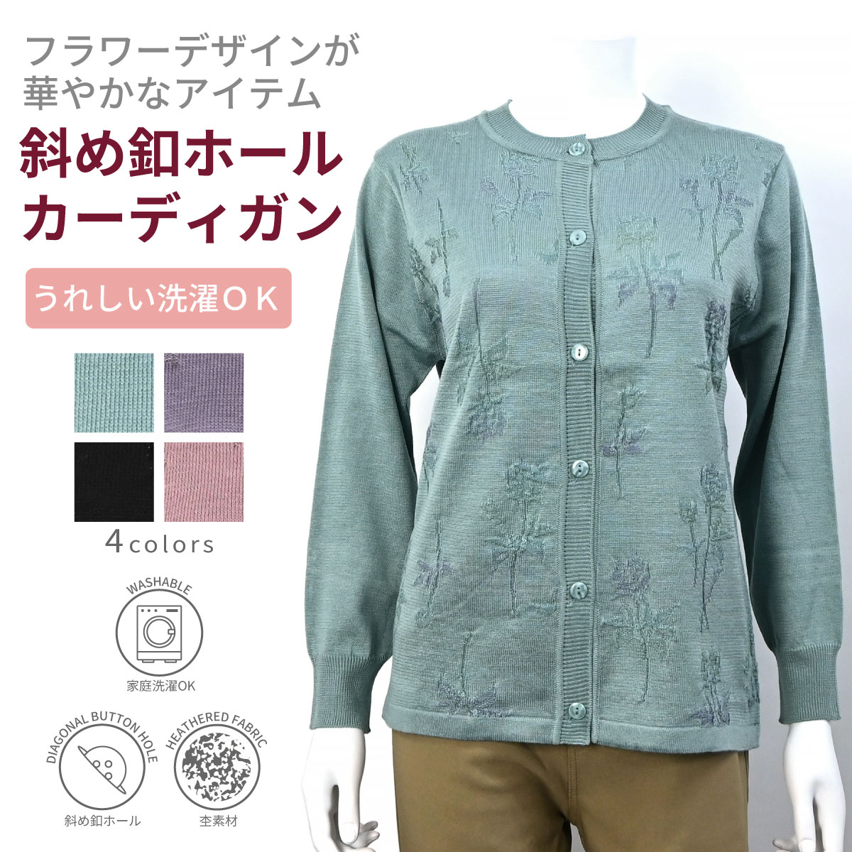 【送料無料】婦人 長袖 斜め釦 ホール 丸首 花柄 ジャガード カーディガン Pono Marie ポノマーリエ