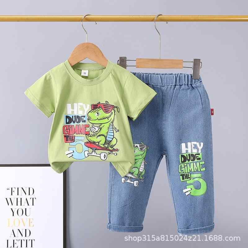 子供用セットアップ キッズ 男児 半袖 Tシャツ デニムショートパンツ 2点セット 綿 カートゥーン 車 動物柄 幼児 80cm 90cm 100cm 110cm 赤 青 緑