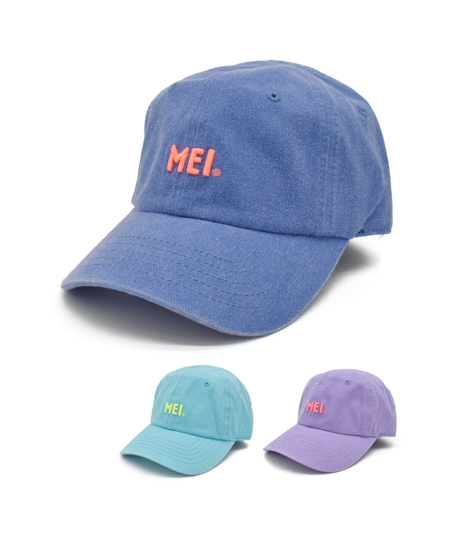 【明るい色展開の3D刺繍キャップ】●ナチュラルなユーズド感のあるピグメント加工に、MEIのロゴを蛍光感の3D刺繍で施したコットンキャップ。●少し長めの7.5cmのつばは、紫外線対策としてもおすすめ。●洗濯機で洗濯可能なので、清潔に着用いただけます。●ユニセックスで着用いただけます。≪商品詳細≫■素材■綿100%■サイズ目安■【FREE】高さ:9.5cm 頭周り:〜60cm つば:7.0cm