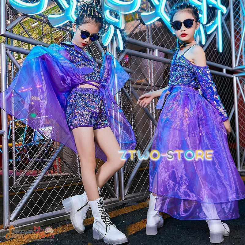 キッズダンス衣装 夏 ヒップホップ パープル キラキラ レース トップス ショートパンツ ガールズ 女の子 ダンスウェア HIPPOP 練習着 原宿 発表会