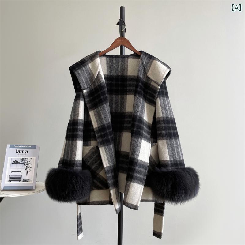 チェック柄ウールコートレディース 冬 ラブポエム 両面 カシミヤコート レディース ネイビーカラー フォックスファー チェック 柄 ケープ ハイエンド ファッション ツイード A 618