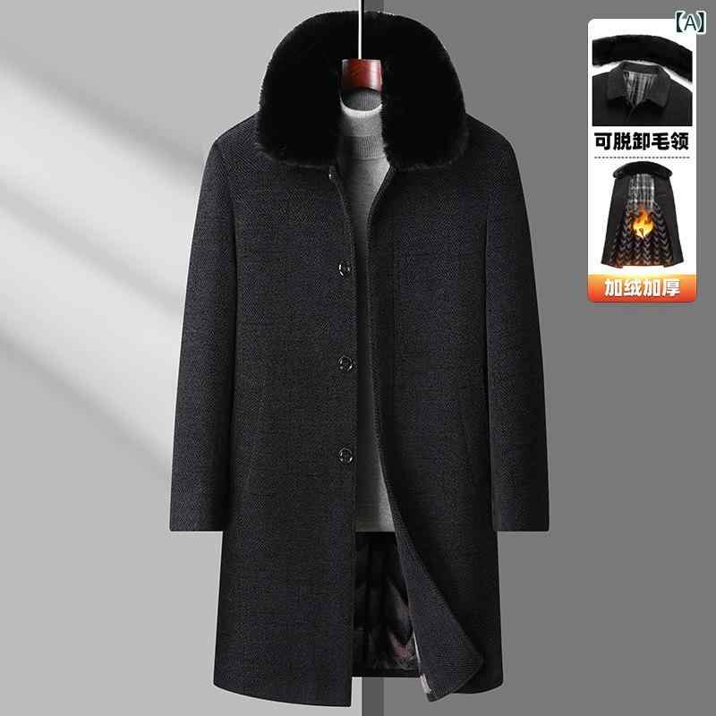 コート メンズ 50代 大人 ロング丈 冬用 保温 厚手 取り外し ファー襟 トレンチコート風 シングルブレスト ポリエステル混紡 免アイロン ステッチ装飾 側縫ポケット ストレート下摆 ビジネス 日常 ブルーグレー ブラウングレー