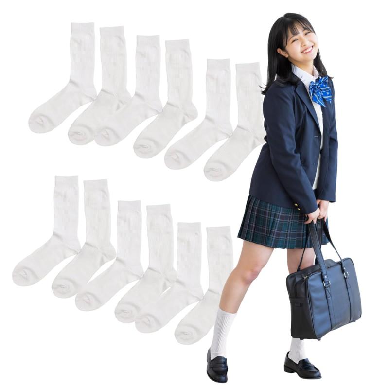 [PUICK] 靴下 レディース 6足組 23-25cm リブ スクールソックス クルー丈 ミドル丈 学生用 通学用 無地 綿混 入学 通学 登校 (JP, 数字サイズ, 23.0 cm, 25.0 cm, 白(ホワイト))