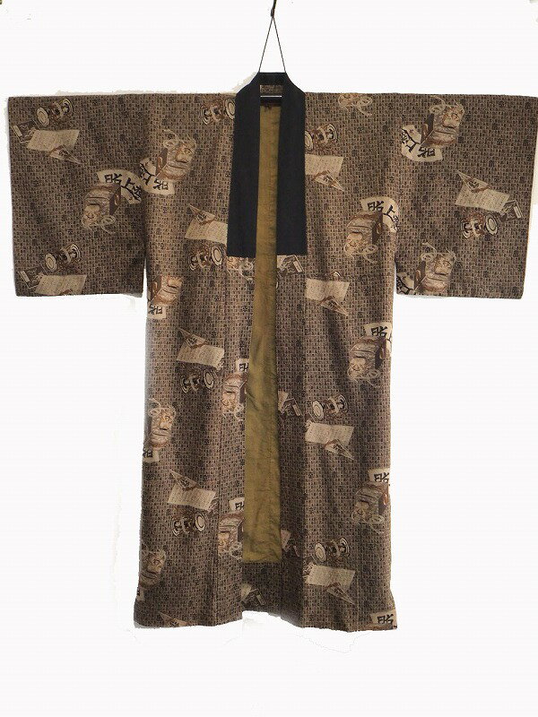 ■商品説明 / Description of item■A men's undergarment for kimono with a mask used in Japanese traditional performing arts "Noh". It is an interesting design depicting the Japanese musical instrument "tsuzumi" and the script. A 'juban' is a garment worn by men under a kimono.サイズ / Size・着丈(後方襟付根〜裾先) 約135.0cm / Length (back collar base-hem) about 53.1in ・肩幅(両肩横直線) 約63.5cm / Shoulder width (both shoulders horizontal line) about 25.0in ・裄(肩頂点〜袖先) 約67.0cm / Sleeve length (shoulder apex-sleeve end) about 26.4in ・袖丈 約51.0cm / Sleeve Tip Width about 20.1inmaterial / 素材Muslin / メリンスcondition / 状態There is a feeling of use. 使用感があります。*Please refer to the location specified in the figure.*写真をご参照ください。 Country of origin / 原産国Japanimportant points / 注意事項Due to the characteristics of the material, some shrinkage and twisting may occur due to washing and cleaning.素材の特性上、洗濯やクリーニングにより多少の縮みやヨレが生じる場合がございます。 We take the utmost care in photographing the products, but depending on the monitor environment at the time of viewing, the colors may appear slightly different from the actual products.商品撮影には細心の注意を払っておりますが、ご覧の際のモニター環境により、実際の商品と多少色味が異なって見える場合がございます。 *当店は、買出し屋です。 実際に一軒一軒のお宅へ出向いて、 蔵や土蔵に眠っている商品を 買わせて頂いています。 その為、骨董品に関しては、 うぶもの (未だ蔵の中で世に出ていない品) を中心に取り扱っております。 昔の方々の巧みの技をそして、 それを大事に使っていた方々の心を 大切にしていただける方々へお届けしたいと思っております。 買い出し情報はこちら↓