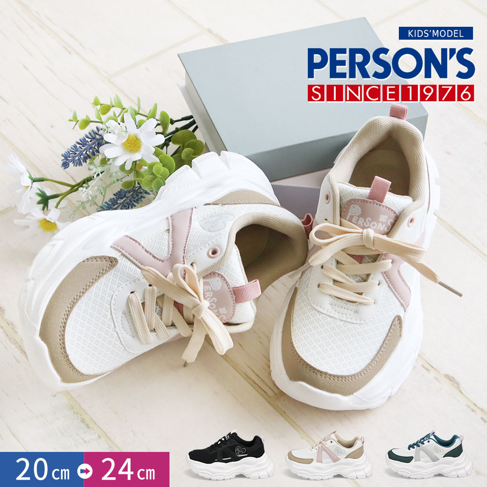 エントリーで全品P10倍\MAX90%OFF/ パーソンズ スニーカー キッズ ジュニア 女の子 厚底 履きやすい 子供靴 紐靴 ダッドスニーカー メッシュ カップインソール かわいい おしゃれ 黒 ブラック ベージュ グリーン PERSONS psj-038