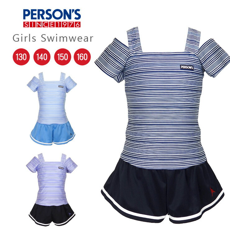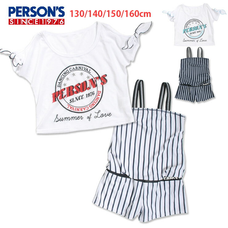 PERSON'S 女の子 トップス付き ワンピース 水着 2点セット 130 140 150 160 パーソンズ 33850502 キッズ ジュニア 子ども 女児 サロペット Tシャツ ストライプ柄 オープンショルダー 白 紺 ホワイト ネイビー