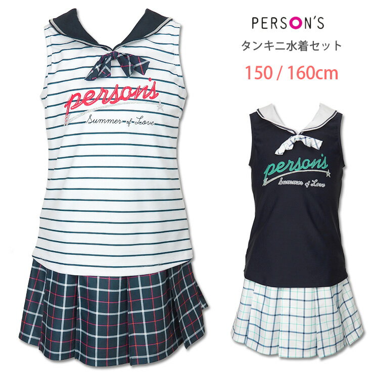 PERSON'S キッズ ジュニア セパレート 水着 3点セット 150 160 パーソンズ 33951342 セットアップ 上下セット スイムウェア タンキニ タンクトップ 子ども 女児 チェック柄 ボーダー セーラー服風 白 紺 ホワイト ネイビー