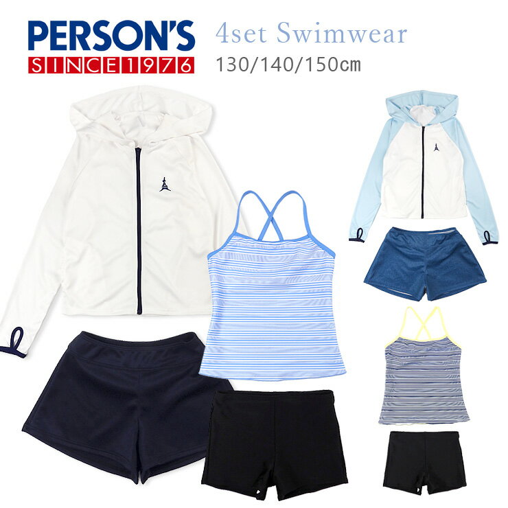 PERSON'S 長袖 ラッシュガード付き タンキニ水着 4点セット キッズ ジュニア 130 140 150 ホワイト サックス 女の子 33250357 パーソンズ セットアップ ラッシュパーカー フード付き 指穴付き ショートパンツ ボーダー ロゴ 白 青 紺 黒