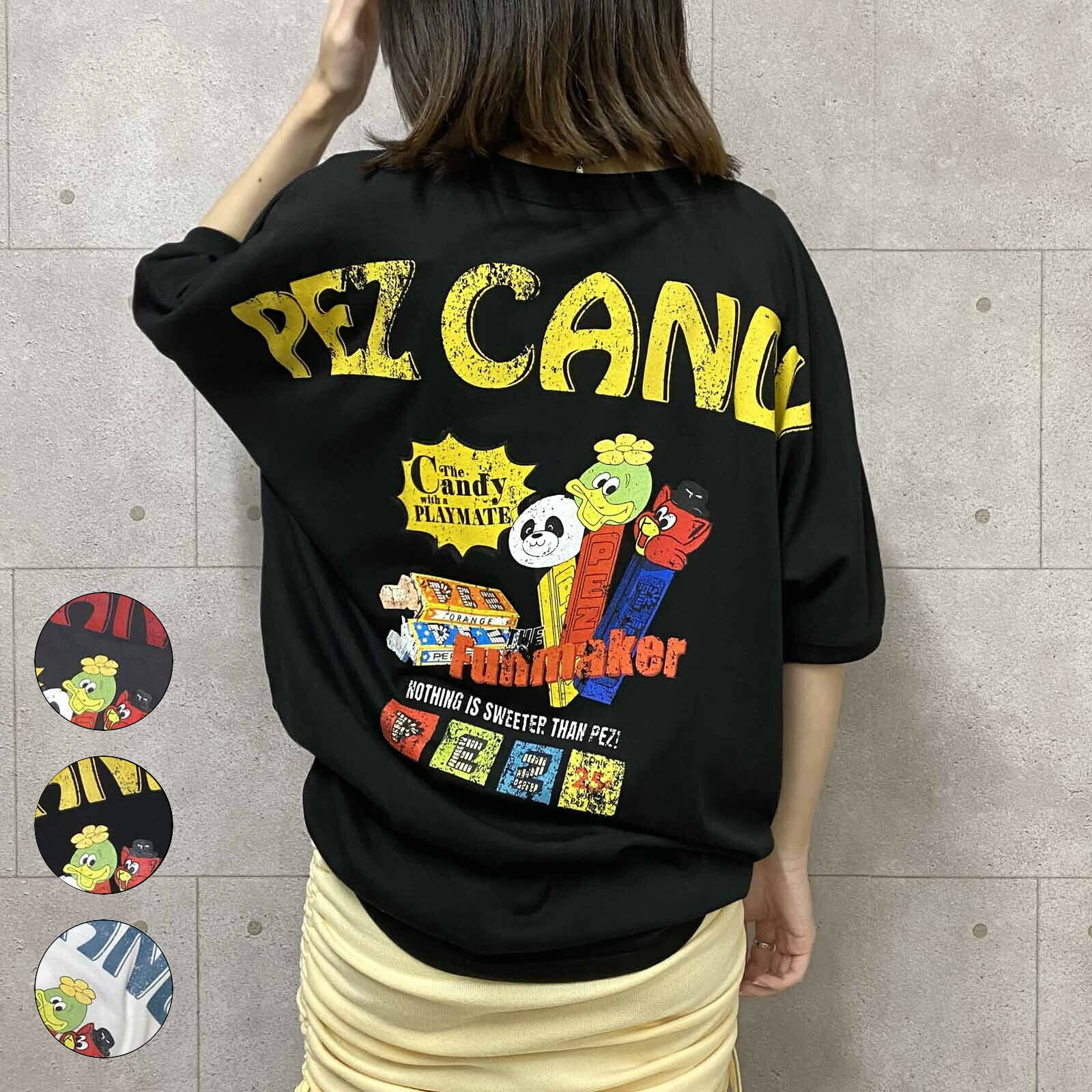 品質 本体:ポリエステル65% 綿35%リブ部分:ポリエステル62% 綿33% ポリウレタン5% サイズ Mサイズ 着丈75cm 身幅128cm 袖丈38cm 袖口幅15cm 裾まわり102cm参考:バスト79-87cm 身長154-162cm 説明 ヴィンテージ風のプリントを施し、所々プリントの剥げや擦れがあるところが味のある雰囲気を感じさせます。 キャラクターの持つイメージそのまま、カジュアルなスタイルにも雰囲気良く合わせていただけます。 デニムやチノパンなどちょっとレトロなアメカジコーデや古着MIXに相性抜群! レトロブームで再注目な商品のイメージとマッチした古着感が秀逸です◎ 肩口まで連なったグラフィックロゴとお菓子のPEZの容器をプリントしたとっても可愛いキャラデザインがインパクトあるバックプリント。 フロントのブロックを組み合わせたようなPEZロゴがこれまたいい味を出してくれています。 ボディカラーでロゴの配色も異なるので、お好きな雰囲気のカラーをチョイスしていただけます。 身体が泳ぐようなオーバーサイズは身体のラインを拾わず、楽なのはもちろん、暑い季節も風通しよく体型カバーができたりメリットが沢山! シンプルでありながら無駄のないデザインはオーバーサイズのトレンドにも馴染みやすいです。 肘くらいまでの長さのある袖丈も落ち着いた雰囲気を演出してくれ『絶対に二の腕見せたくない』という方にもオススメです! お尻まですっぽり隠してくれるチュニック丈は安心感もあり変わらず人気のアイテム。 ふわっと丸いシルエットを活かすような、細身シルエットのボトムスは特に相性抜群! ワイドパンツやボリュームスカートはタックインしてバランスを取れば、今っぽい抜け感を楽しめます◎ ※ホワイトはやや透け感がございますので、インナーの着用を推奨します。 生産国:中国 ■メール便でのご注文の場合は送料無料です。 商品によっては少し押し込むような形での梱包になりますのでご了承いただける方のみメール便でご注文下さい。PEZ ドルマンチュニックT 半袖Tシャツ PEZ (ペッツ) ドルマンチュニック Tee Tシャツ レディース 半袖 プレゼント ギフト 【メール便送料無料】