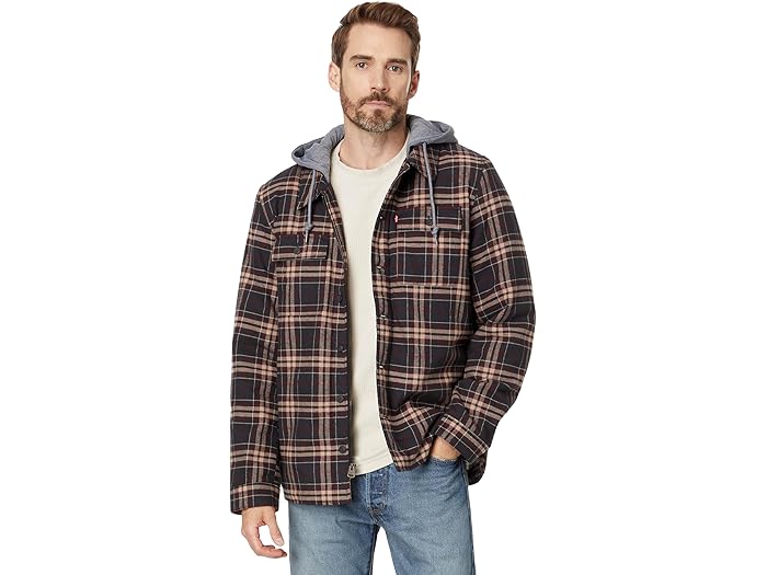 (取寄) リーバイス メンズ ウォッシュド コットン シャツ ジャケット ウィズ ア ジャージ フード アンド シェルパ ライニング Levi's men Washed Cotton Shirt Jacket with A Jersey Hood and Sherpa Lining Brown Plaid