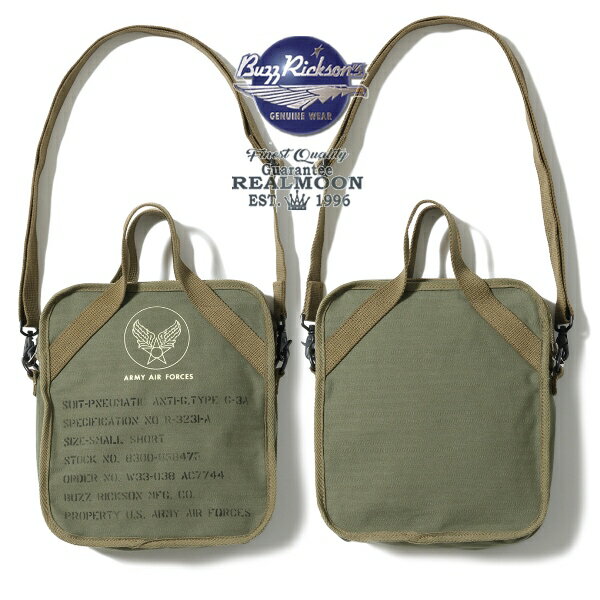 BUZZ RICKSON'S TYPE G-3Aバッグ No.BR02833 "SUIT-PNEUMATIC ANTI-G, TYPE G-3A H.B.T. BAG" バズリクソンズ 鞄 ショルダーバッグ メンズファッション アメカジ ミリタリー BUZZ RICKSON'S "SUIT-PNEUMATIC ANTI-G, TYPE G-3A H.B.T. BAG" 第二次大戦中、パイロットに掛かるGを軽減するため採用されたのがタイプG-3Aスーツである。強烈な負荷が掛かるGは血流に影響し、血液は脳から下半身に流れ、脳内の血液が欠乏すると視界が真っ暗になり、終いには意識を失った「Gロック」状態となってしまう。血液が手足の先端に流れないよう身体にコードできつく絞めつけるスーツが開発された。そのスーツを収納するため付属したのがこのバッグである。縫い合わせ箇所には手間と時間を掛けたパイピングが施され、ジッパーは大戦型TALONジッパーを使用している。容量こそコンパクトであるが、転写式のエアフォースマークと、所狭しと施された目一杯のステンシルが陸軍航空隊のプライドを表している。商品コード : BR02833製造元 : BUZZ RICKSON'S素材 : 表地)COTTON 100% / 皮革部分)馬革生産国 : 日本COLOR : 149)OLIVE【SIZE(FREE)】 高さ : 24.0cm前後 / 幅 : 21.0cm前後 / 奥行き : 10.0cm前後素材の特性や仕上げの方法により、各所の寸法には個体差が生じます。また、モニター環境により現物と色が違って見える場合がございますのでご了承ください。************************************************在庫情報は実店舗と共有している場合がございます。在庫更新が間に合わず、売り違い欠品の際は何卒ご容赦ください。(メーカー様の在庫を確認いたしましてご連絡差し上げます。)【返品および交換に関しまして】海外発送後等の返品および、交換等は一切不可とさせていただきます。(転売取引も含みます)Regarding returns and exchanges.We do not accept returns or exchanges after overseas shipment. (Including resale transactions)その他、返品・交換をご希望の場合は弊社出荷日付7日以内にメールまたはTELにてご連絡ください。8日以降は一切不可とさせていただきます。 5