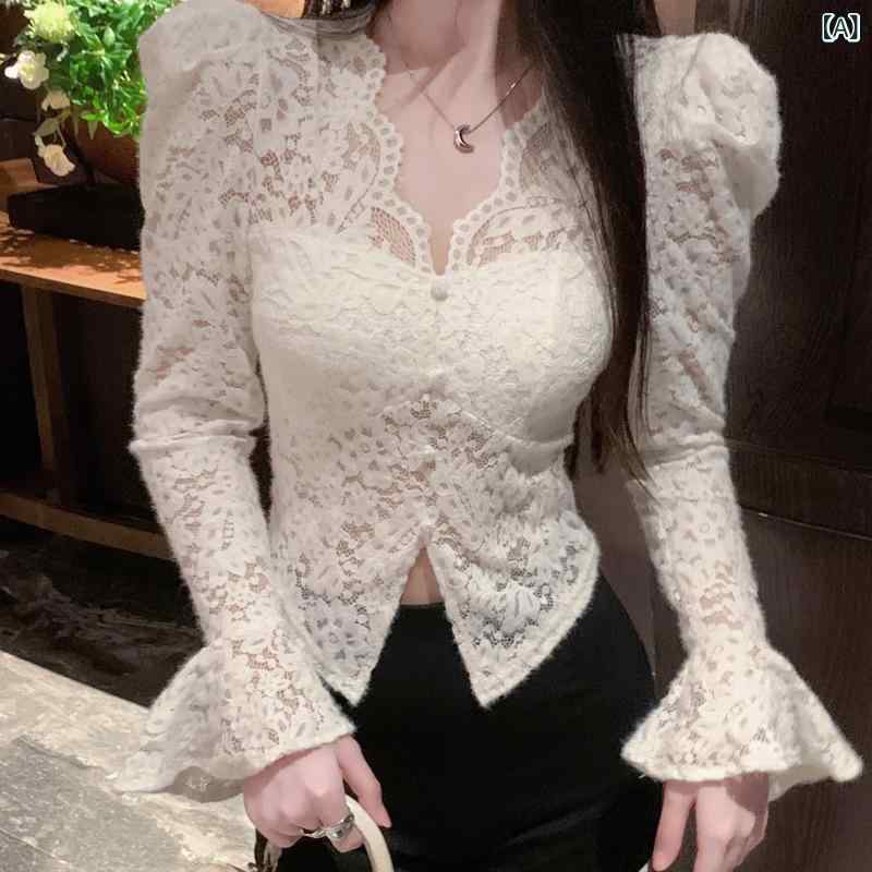 ・主な素材: レース、ポリエステル (ポリエステル90~95%)・ネックライン: Vネック・袖タイプ: フリル袖・袖丈: 長袖・デザイン: レース・カラー展開: ホワイト、ブラック・サイズ展開: フリーサイズ・スタイル: エレガント、アーバン・着用方法: プルオーバー・対象性別: レディース