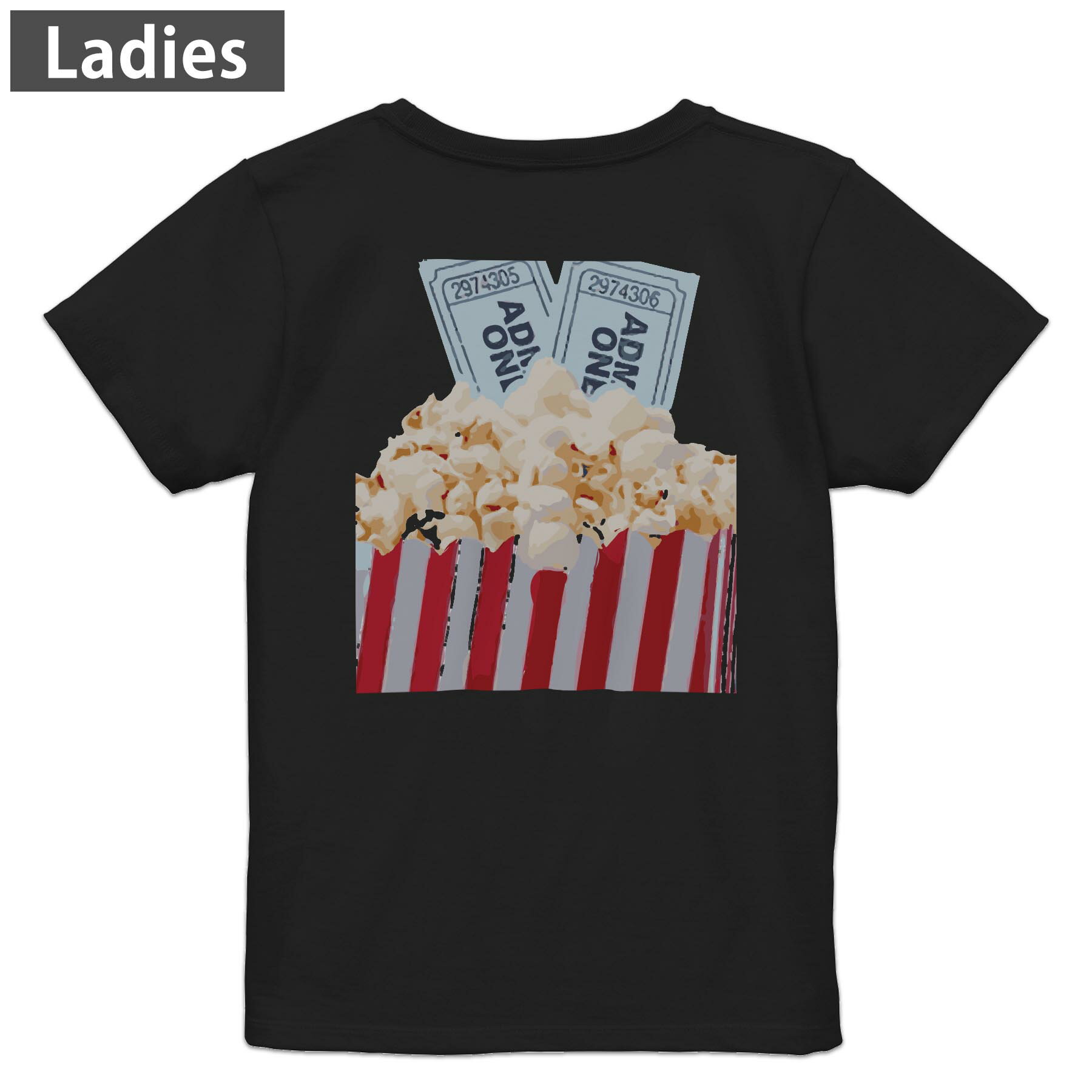 Tシャツ レディース バックプリント 半袖 ブラック 黒 デザイン M L tシャツ ティーシャツ T shirt 026232 ポップコーン お菓子