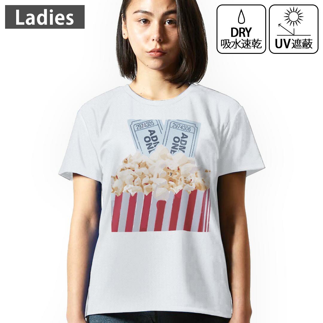 レディース ドライTシャツ ホワイト 半袖 4.1オンス ジム トレーニング スポーツ 運動会 ドライアスレチック UVカット 紫外線遮蔽 吸水速乾 デザイン Tshirt M L 026232 ポップコーン お菓子