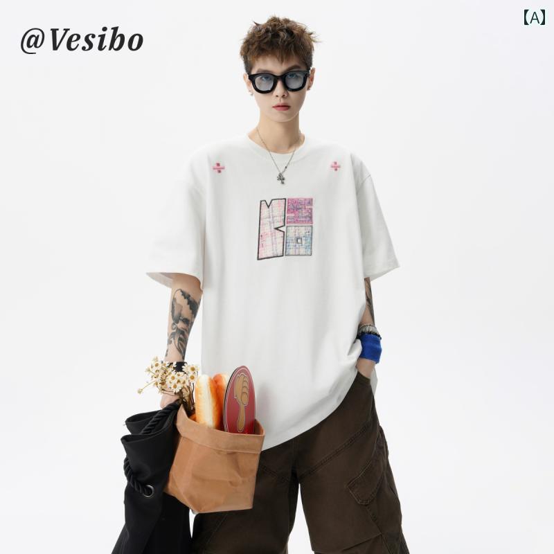 ストリート スタイル Tシャツ ファッション の 刺繍入り 半袖 Tシャツ メンズ 夏用 ヘビー カジュアル カップル ストリート トップ