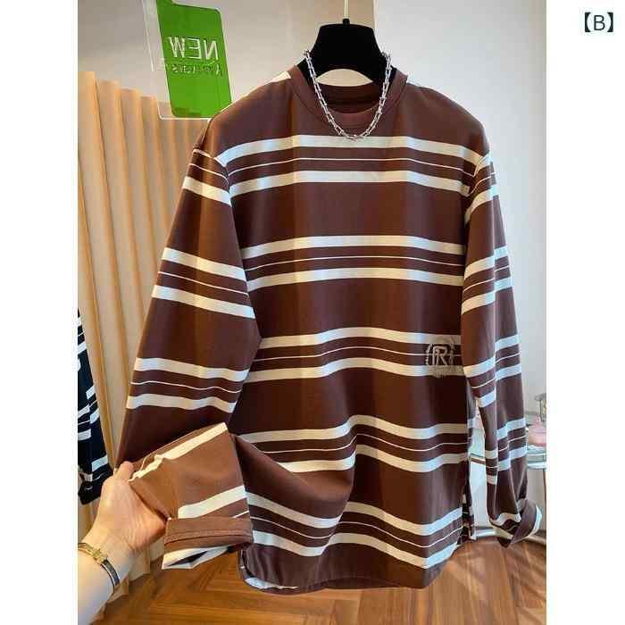 Tシャツ レディース 大きいサイズ ストライプ柄 長袖 秋冬 チュニック丈 ゆったりサイズ トレーナー トップス プルオーバー ブラック 黒 ブラウン 茶色
