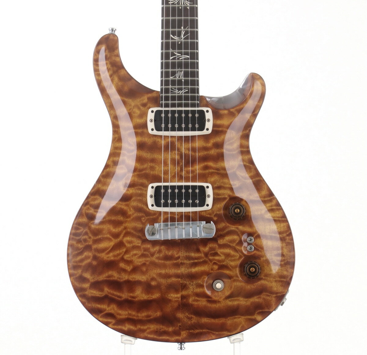 2014年製、メリーランド工場製造、ポールリードスミス本人の名を冠したモデル、Paul's Guitarが入荷。ダーティアーティストグレイドキルトメイプルトップ、マホガニーバック、マホガニーネック、ブラジリアンローズウッド指板&ヘッドストックベニアを採用した最初期スペック。ピックアップは408Narrow Neck&Brent Mason Bridge、最初期ならでは名義の混在であると考えられます。ブラスインサートストップテイルブリッジ、フェイズ2チューナーペグを搭載。後のCustom24-08に通ずるそれぞれのピックアップを個別にコイルタップするミニスイッチ等、当時からその先進性が伺えます。このレベルのキルトメイプルはプライベートストックでしか扱えない今日において、大変希少なモデルと言えます。 ネック裏、ネックヒール部、バックプレート付近、ボディ外周部を中心に塗装白濁あり。リフレット済み、シャーラータイプストラップピンに交換。全体に傷や汚れのある、年式相応のプレイヤーズコンディションです。入荷後クリーニング、全体調整、すり合わせ済みで演奏状態は良好です。 ※中古品につき、傷・打痕等、写真に写りにくい部分や記載以外の傷があります。予めご了承くださいませ。 ※トラスロッド、フレット残り、弦高等の記載がある場合は当社スタッフがセットアップ時に計測したものであり、 気候、湿度等、環境の違いによる影響等で、変化が起こります。数値は購入時の参考としてご利用いただく事を想定しており、 お手元に届いた際に同数値である事をお約束するものではございません。 ※こちらの商品は現物1点限りを、店頭展示を含め複数のモールに同時掲載しております。 売却に伴う商品情報の削除は迅速を心掛けておりますが、必ずしもリアルタイムではございません。 ご注文後に万一売り切れとなっておりました際は、誠に申し訳ございませんがご容赦くださいませ。 製品仕様 商品ランクB+:多少傷はあるが通常使用する用途において問題なし保証期間12ヶ月シリアルナンバー14 209374製造年2014製造国アメリカケースハードケース付属品ロックピン(ストラップ側)重量3.75kgトラスロッド【問題なし】ロッド左右60度まで確認済みにて問題なしフレット残り【問題なし】充分なフレット高さあり弦高低音弦側12フレット上 2.0mm弦高高音弦側12フレット上 1.5mmナット幅42.8mmネック厚1フレット付近22.3mmネック厚12フレット付近24.1mmスケール635mm (25")RADIUS254mm (10")セットアップ時の弦ERNIE BALL 2221 / .010-.046 setリペア・メンテナンス箇所クリーニング・弦交換・ロッド調整・オクターブ調整・弦高調整・フレットすり合わせ