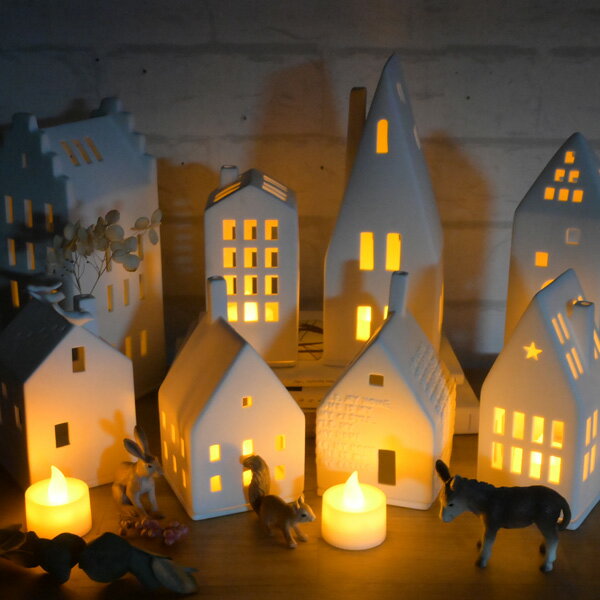 【商品概要】 とんがり屋根のお家の磁器製キャンドルホルダーです。 中から漏れ出すキャンドルの灯りは、見ているだけで心が癒されます。 窓の形や位置など、四面全て異なります。 中にLEDキャンドルを入れてご使用ください。 ※LEDキャンドルは付属しておりません。 ※本物のキャンドルのご使用はお控えください。 キャンドルを入れずにそのまま飾るだけでも、可愛いインテリアになります。 すっきりとしたデザインと色合いは、お部屋の雰囲気を邪魔しません。 暗い部屋の中に浮かぶお家のシルエットとキャンドルの灯りは、幻想的な雰囲気を生み出します。 【ご使用上のご注意】 ※手作業でくり抜いているため歪みやバリが残っている場合がございますが不良品ではございません。 ※小さな黒い点が見られる場合がございますが、不良品ではございません。 ※本物のキャンドルのご使用はお控えください。煤で黒く汚れたり、本体が熱くなり火傷をする可能性がございます。 ※LEDキャンドルは付属していません。 ※モニター環境により、色味が違って見える場合がございます。 --------------------------- サイズ/ 約6×6×高さ20.5cm 材質/ 磁器