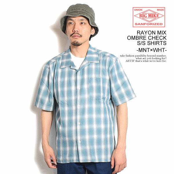 BIG MIKE ビッグマイク RAYON MIX OMBRE CHECK S/S SHIRTS - MNT×WHT メンズ シャツ 半袖 チェックシャツ オンブレチェック 送料無料 ストリート