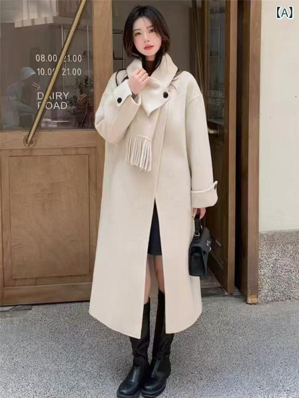 コート レディース 秋冬 マフラーデザイン 韓国風 ウール混 ミドル丈 ダブルボタン Vネック 長袖 ゆったり ルーズフィット リラックス カジュアル アウター