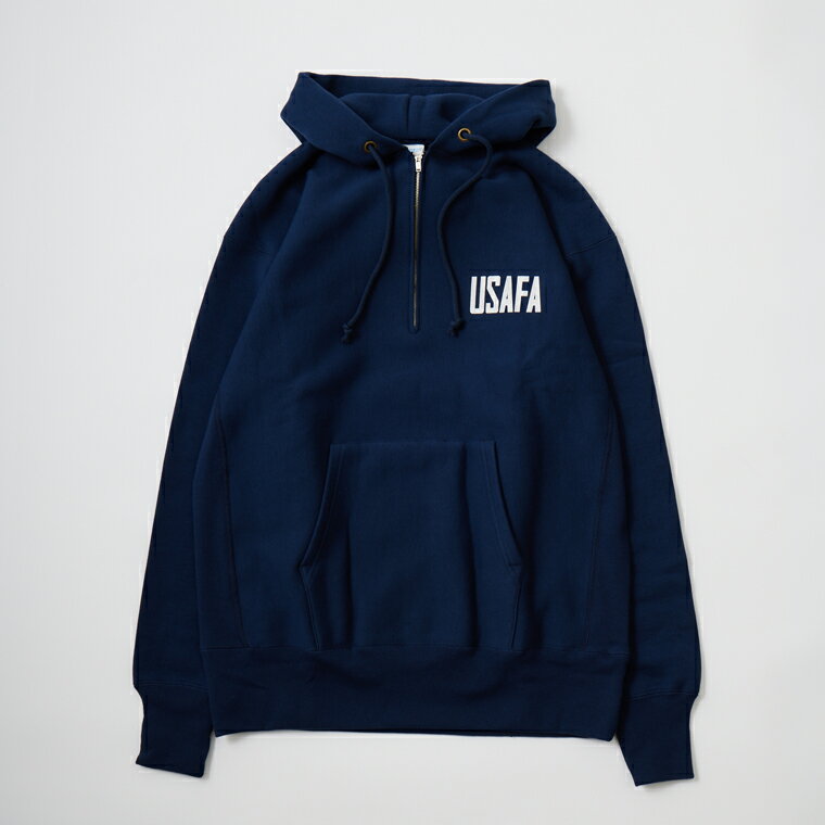 CHAMPION (チャンピオン) TRUE TO ARCHIVES REVERSE WEAVE HALF ZIP HOODED SWEAT SHIRT - NAVY PLASTISOL PRINT ハーフジップ パーカー メンズ