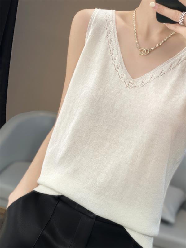 タンクトップ レディース 薄手 Vネック ウール混 ニット トップス ノースリーブ インナー 無地 グレー 白 黒 カーキ 緑 ピンク系