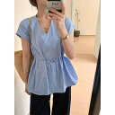 シャツ レディース 韓国風 ストライプ ウエストベルト 半袖 Vネック シンプル カジュアル 着回し 夏 ポリエステル ブルー ホワイト ネイビー 切り替え