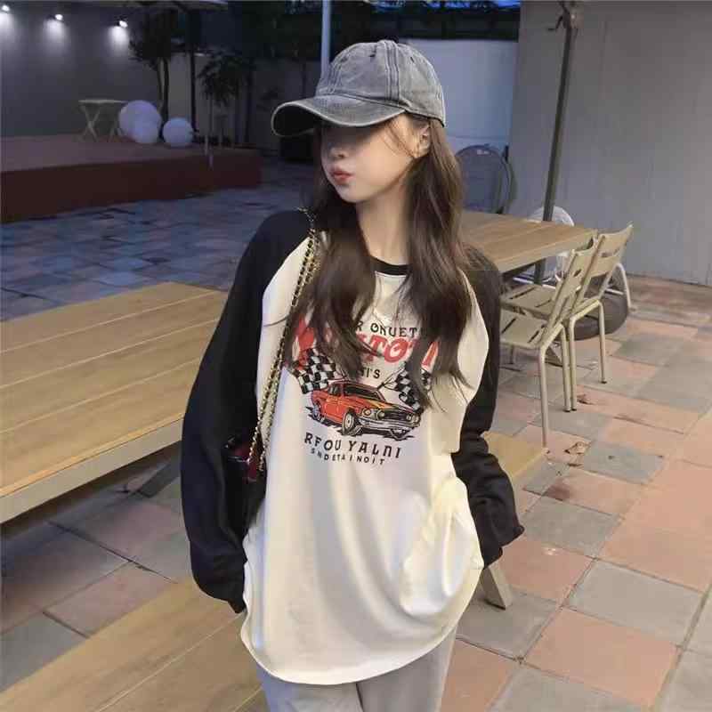 Tシャツ レディース アメリカン レトロ トップス 配色 長袖 カットソー 秋冬 ドロップショルダー ポリエステル 普段使い 部屋着