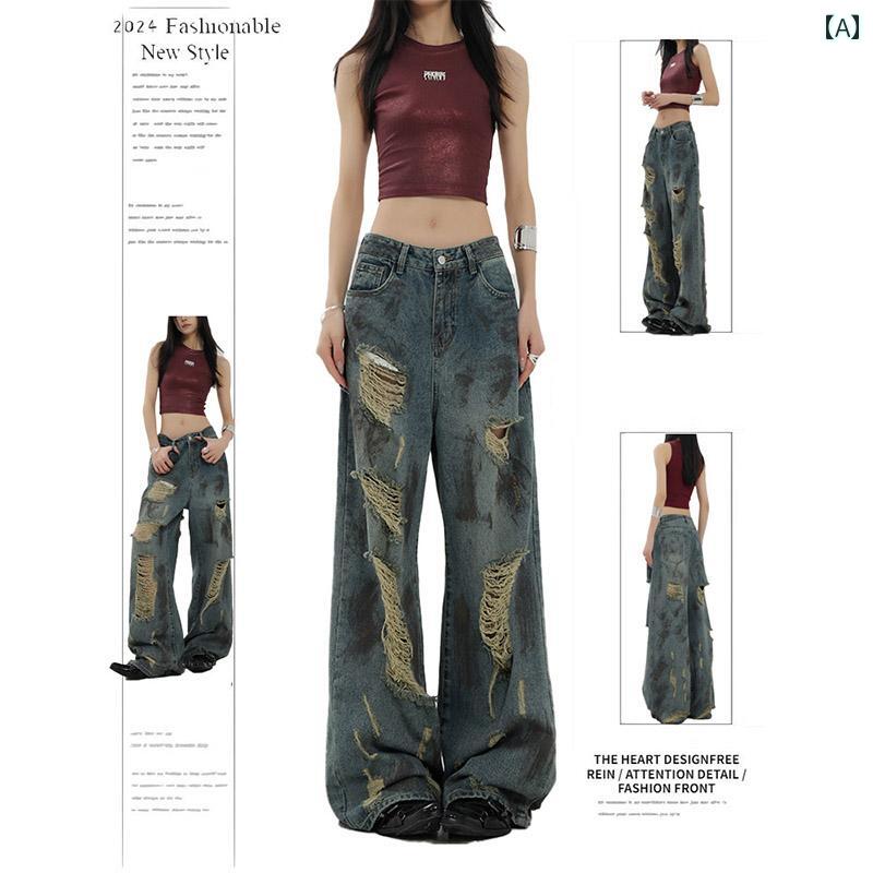 廃墟風の復古な墨を巧みに使った穴あきデニムパンツ。女性らしいデザインで高めのウエストがスタイルアップし、長めのワイドレッグで地に引きずるような長さのパンツです。春夏の新作アイテムです。