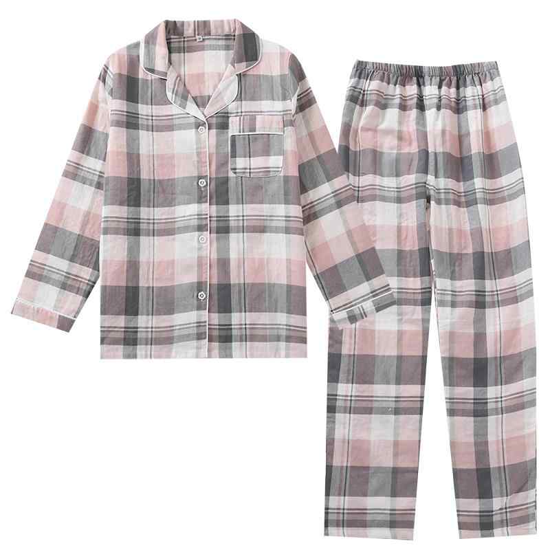 パジャマ ペア ガーゼ 夏 男女兼用 薄手 長袖 ゆったり コットン 部屋着 ナイトウェア リラックス ウエストゴム 通気性 柔らかい 前開き カップル 夫婦 シンプル カジュアル 緑 ピンク チェック柄