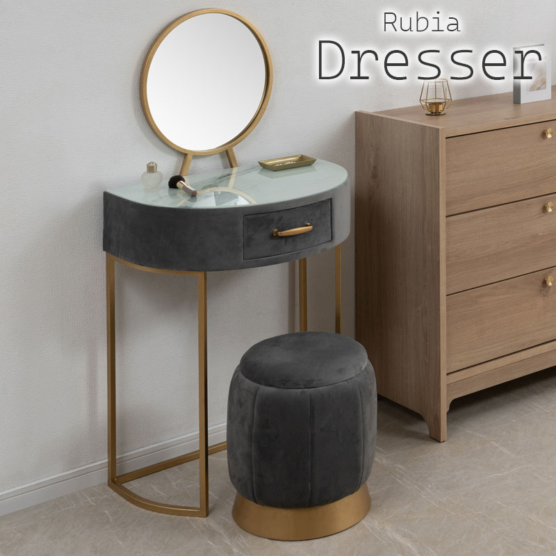 ベロア生地と大理石柄ガラス天板とゴールドの組み合わせたドレッサー 【rubia】幅60.5 奥行43cm グレー ピンク グリーン ドレッサー 引出し 鏡 ベロア生地 推し活 ミラー付き スツール 鏡台 収納 化粧台 セット フェミニン