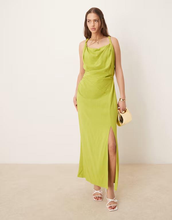 エイソス レディース トップス ワンピース ミディワンピース ミディ リネン ASOS DESIGN linen twist shoulder detail midi dress with ruching in pale PALE GREEN グリーン