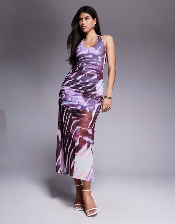 エイソス レディース トップス ワンピース マキシワンピース プリント メッシュ マキシ ホルター ASOS DESIGN halter mesh maxi dress with ruching in abstract zebra print Print アニマル