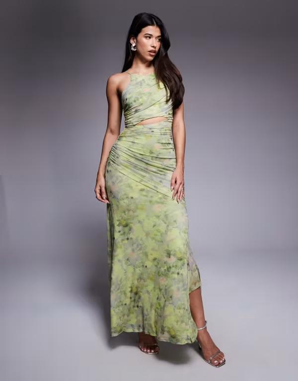 エイソス レディース トップス ワンピース アシンメトリー マキシワンピース フラワー柄 プリント メッシュ マキシ フラワー ホルター ASOS DESIGN mesh square halter maxi dress with asymmetric ruching in floral print floral print