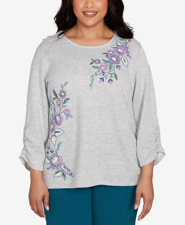 アルフレッド ダナー レディース トップス シャツ プラスサイズ 刺繍 Alfred Dunner Plus Size Lake Champlain Embroidered Flowers Top with Side Tie Ruching Gray グレー