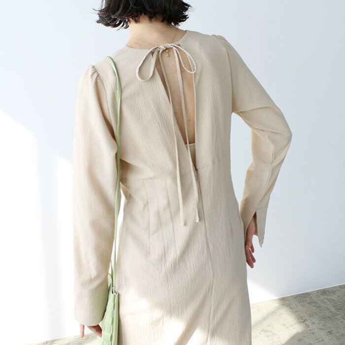バックオープンデザインが今っぽい♪すっきりとしたIラインシルエットが可愛い大人ワンピース〇バックオープンデザインのヘルシーな肌見せデザイン〇バック紐リボン〇長めの袖口にはスリット入り〇肩ギャザー入り、ボリュームスリーブデザイン〇すっきり見えするIラインシルエット■素材表面感のある素材が価値観をプラス。……………………透け感:なし厚さ:普通伸縮性:なし裏地:なし……………………■カラー:ベージュ、ブラックS:バスト89、肩幅33、前身丈126、袖丈64M:バスト94、肩幅34、前身丈127、袖丈65L:バスト99、肩幅35、前身丈128、袖丈66※( )で表記されている数字はヌードサイズです。ヌードサイズとは衣服を身につけない身体のサイズです。お客様ご自身の身体サイズと比較してお選びください。 ■素材: ポリエステル99%、 ポリウレタン1% ■お手入: 手洗い >>商品のお取り扱い方法 ■原産国:華奢見えバックオープンタックワンピース/ジーラ バイ リュリュ(GeeRA)ベージュブラック画面上と実物では、多少色具合が異なって見える場合がございます。