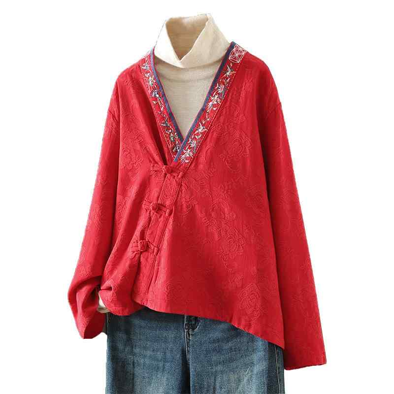 ブラウス レディース 新中華風 レトロ 斜め合わせ チャイナボタン 紐付き ジャカード織り 綿麻 刺繍 Vネック ゆったり 開襟 長袖 ドロップショルダー 春夏 きれいめ 通勤