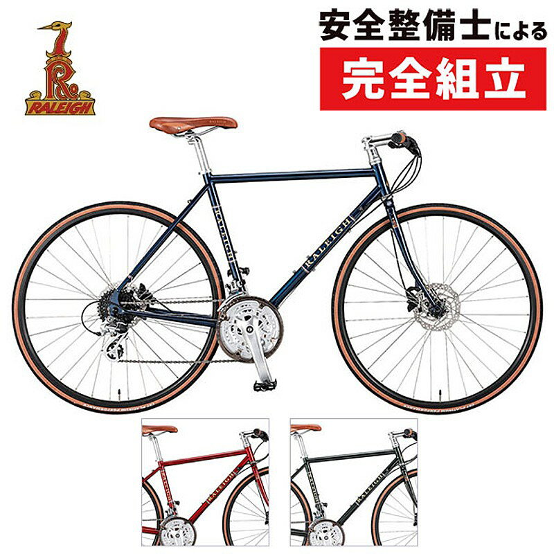 ディスクブレーキを使用した全天候型クロスバイクをラレーならではのアレンジ。クラシックなデザインを踏襲しながら、妥協しないスペック。耐パンク性の高いクラシックカラーサイドタイヤ、シマノ製ハイドロリックディスクブレーキ。ニュースタンダードにもラレーの実用主義を貫きます。スタンドは付属しません。Frame:CR-MO MID-SIZE D.B. TIG WELDINGFork:CR-MO W/ INVESTMENT-CAST CROWNHead set:FSA INTELLASET 1-1/8” AHEAD W/ 5 10 10 15mm SPACERSBB set:FSA BB-7420 68-113mmHandle Bar:KALLOY HB-FB11 FLAT BAR 540mm 31.8mmHandle Stem:KALLOY AS-007N -7° FLIP-FLOP 80mm(440) 100mm(480 520)Bar-tape/Grips:DOUBLE-DENSITY W/ ALLOY RINGSShifter:SHIMANO ST-EF505 8×3 SPEED EZ-FIRE HYDRAURIC DISC BRAKE LEVERRear Derailleur:SHIMANO ALTUS RD-M310Front Derailleur:SHIMANO ALTUS FD-M313 28.6mmChainwheel:PROWHEEL 48-38-28T W/ GEAR GUARD 170mmGear:SHIMANO CS-HG31 11-32T 8 SPEEDChain:SHIMANO CN-HG40Pedals:MARWI SP-600 BLACKBrakes:SHIMANO BR-MT200 HYDRAURIC DISC BRAKE W/SM-RT10S DISC ROTORLevers:SHIMANO ST-EF505Hubs:SHIMANO HB-QC300 / FH-QC300 32H 100×135mmSpokes:14G STAINLESSRims:SHINING RIMS A-M6 700C BLACK 32HTires:CST PLATINUM PERFORMANCE 700×28C F/VSaddle:VELO CLASSIC SPORT RALEIGH SPECSeat Pillar:KALLOY SP-265 27.2×300mmWeight:12.9kg(440mm)防犯登録について通信販売にて防犯登録を行うことは禁止されている為、お受けすることができません。自転車の到着後、保証書、身分証明書等をお持ちの上、お近くの自転車防犯登録所(自転車販売店等)にてご自身で手続き(有料)をお願いいたします。 商品のカラー・サイズについて商品のカラーはディスプレイの種類等により、実物と異なって見える場合がございます。掲載商品の仕様、ロゴ等のデザインは改良のため、変更される場合がございます。また、メーカーが発表していない寸法や個人的なフィット感についてはお答えいたしかねます。あらかじめご了承ください。※完成車の送料について※完成車の沖縄・離島地域への発送には、表示送料に追加で送料が必要です。(送料無料と表示がある場合でも別途必要です)※組立整備が必要な商品の為、ご注文から出荷までに7〜10営業日ほどお時間を頂戴しております。 ※ご指定日を入力いただいても、ご要望にお応えできない場合がございます。※完成車の発送について ※完成車の沖縄・離島地域への発送には、表示送料に追加で送料が必要です。 ワールドサイクルで完成車を購入する場合、下記動画を参考に組み立てを行ってください。前後輪とシートポストの取り付け作業が必要となります。取り付けに自信のない場合は、リアル店舗でのご購入をおすすめいたします。生産工程における塗装ムラや小さな傷などがある場合がございます。そういった理由での返品・交換はお受けできません。