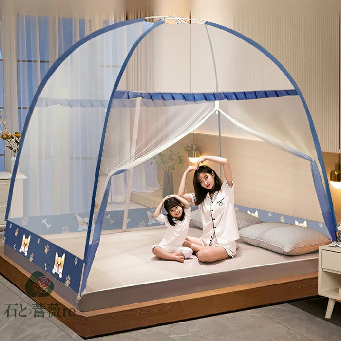 |  【楽天ランキング1位入賞】蚊帳 ワンタッチ モスキートネット 折りたたみ式 日本語説明書付き 幅120cmx奥行200cm ブルー (ブルー, 幅120cmx200cm)