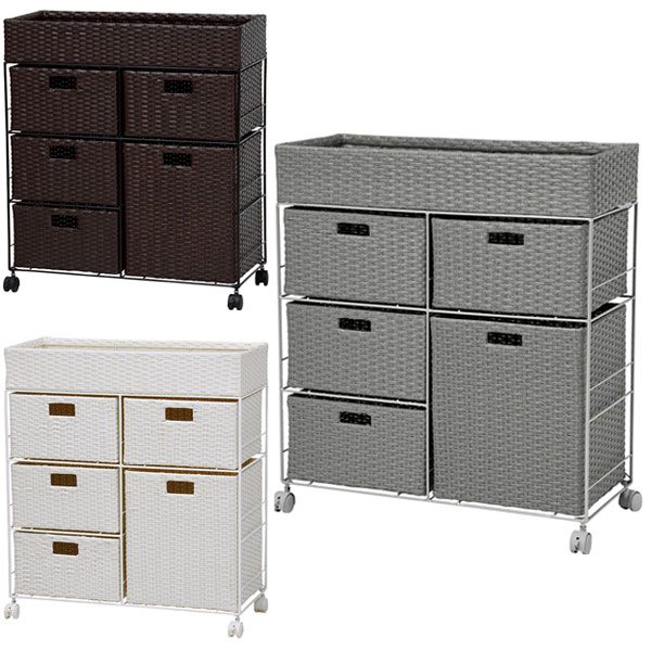 ●ラタン風のシンプルなデザインでランドリーやキッチン、リビングや寝室にもぴったりなチェストです。●ポリエチレン素材は衣類が引っかかりにくく、水に強くカビも生えずらいので清潔。湿気のある水回りでもサッと拭けます。●上段のカゴは脱衣カゴとしても使用できます。●お掃除の時など移動に便利なキャスター付き。ストッパー付きなので固定もできます。■耐荷重(約)上棚:2.5kg引き出し:3kg【詳細サイズ(約)】■引出し内寸 幅25.5x奥行27x高さ15cm(x4) 上部収納内寸:幅27.5x奥行27.5x高さ8cm※こちらはメーカー直送商品です。ホワイト/5603411ダークブラウン/5603412主な素材:スチール/ポリエチレンサイズ(約):幅30.5×奥行30.5×高さ85cm保証年数:1年重量:約7kg組立時間目安:10分納品方法:玄関先迄納品日時指定について
