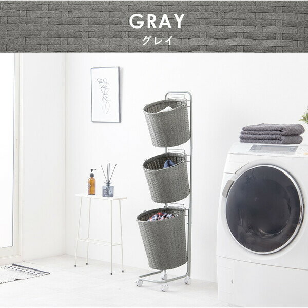【返品種別A】□「返品種別」について詳しくはこちら□2020年11月 発売■外箱について配送中に外箱に汚れや傷が生じる場合がございます。誠に申し訳ございませんが、外箱のみの汚れや傷による商品の交換や返品は受け付けておりません。(商品に破損・欠品があった場合は、その限りではございません。)◆色柄物や汚れた洗濯物を分けて溜められるランドリーワゴン。◆バスケットは持ち運べて便利。◆デザインと使いやすさを追及したランドリーラック。圧迫感を感じさせないスリム幅な縦長タイプ幅約36.5cmとスリムでありながら縦方向しっかりと収納ができ、狭い場所でも圧迫感を感じにくく設置がしやすいラックです。大容量な3段バスケットかさばる洗濯物もたっぷり入る大口で放り込みやすいので使い勝手抜群です。・容量(約)…上段バスケット:14L下段バスケット:26L◎3個のバスケットで衣類を仕分け3個あるバスケットで色移りしやすい衣類やタオルを分けたり干す時用にハンガーなど分けて入れておけば効率的。◎取り出しやすく計算された傾斜衣類が取り出しやすいように傾斜を付け、楽に出し入れが可能。バスケットはフックで引っ掛けるタイプなので取外して持ち運びもらくらく。ラタン調でスッキリ美しく爽やかな空間に生活感が出やすい洗濯物もラタン調で美しく爽やかな空間に早変わり。見た目もスッキリなので飽きがきません。使いやすさを考えた便利機能移動がしやすいキャスター付き。脱衣所から洗濯物をそのまま運べ、ストッパー付きで安全に使用ができます。・防水しっかりと水を弾き、濡れてもタオルで拭くだけでOK。・取っ手付きバスケットには取っ手が付いているので持ち運びがらくらく。スタッキングが可能でバスケット単体で置きたい時に重ねれば省スペースで置くことができ便利です。簡単組立重さはあまりなく複雑な工具も必要ないので女性や組立が苦手な方でも簡単に設置ができます。■ 仕 様 ■サイズ(約):幅36.5×奥行37×高さ129cmカゴ内寸(約)…上段・中段:幅30×奥行30×高さ25cm下段:幅33×奥行33×高さ35cm全体耐荷重(約):20kgキャスター付材質…主材:スチール張地:ポリエチレン組立:お客様組立[RAN2432GY]萩原生活家電>生活雑貨>洗濯用品(物干し・ハンガーなど)>ランドリーラック